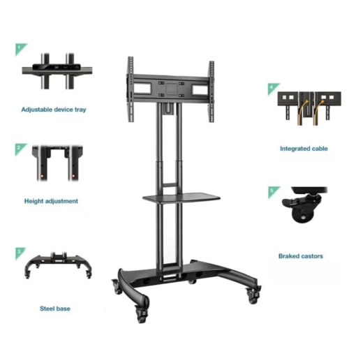 Los detalles importan: el doble pilar garantiza suficiente espacio para que el cable pase y mantenga un aspecto ordenado. El soporte de TV con ruedas viene con un estante AV para colocar dispositivos AV relacionados y una bandeja en la parte superior para la cámara, lo que hace que este carrito de TV sea bueno tanto para la oficina como para el hogar.