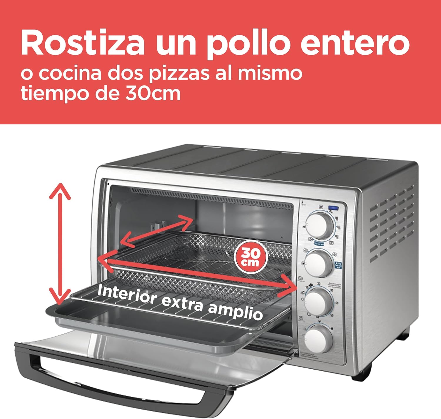 - Capacidad extra amplia. Hornea una pizza de 30 cm