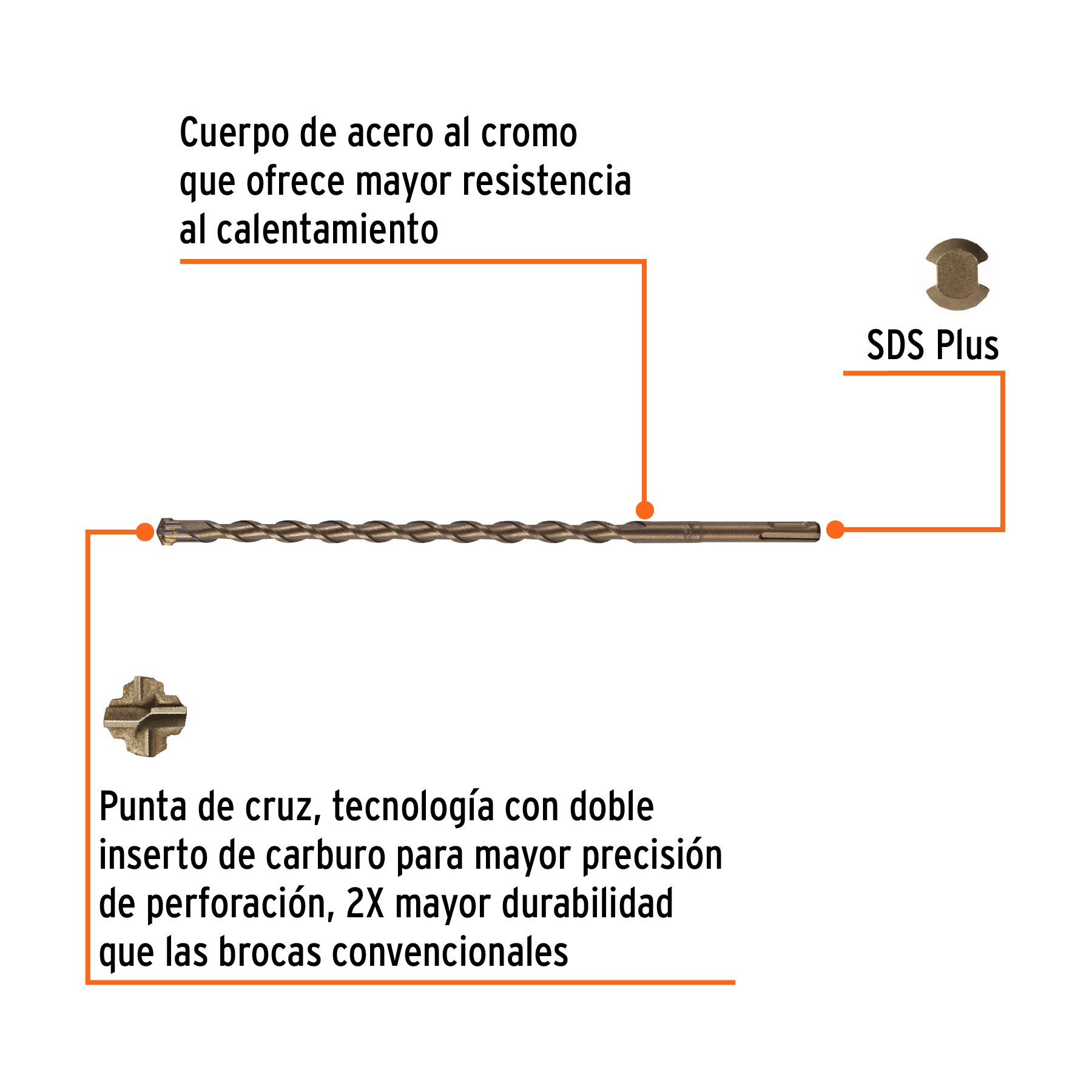 • Punta de cruz, tecnología con doble inserto de carburo para mayor precisión de perforación, 2X mayor durabilidad que las brocas convencionales