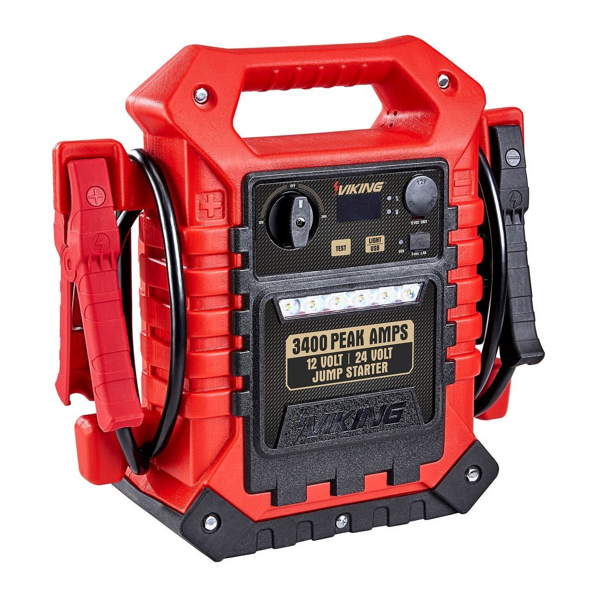El arrancador auxiliar de 12/24 voltios y 3400 amperios pico VIKING® ofrece un potente amperaje de arranque para arrancar baterías débiles o agotadas en todas las condiciones climáticas. Este arrancador auxiliar tiene suficiente potencia para hacer funcionar motores grandes, incluidos los de gasolina V12 y los diésel V8. Los cables de arranque de grado industrial de 34 pulgadas y calibre 2 AWG están equipados con abrazaderas extra resistentes para una conexión segura. La luz LED de alta intensidad proporciona una gran iluminación de emergencia para reparaciones en la carretera.