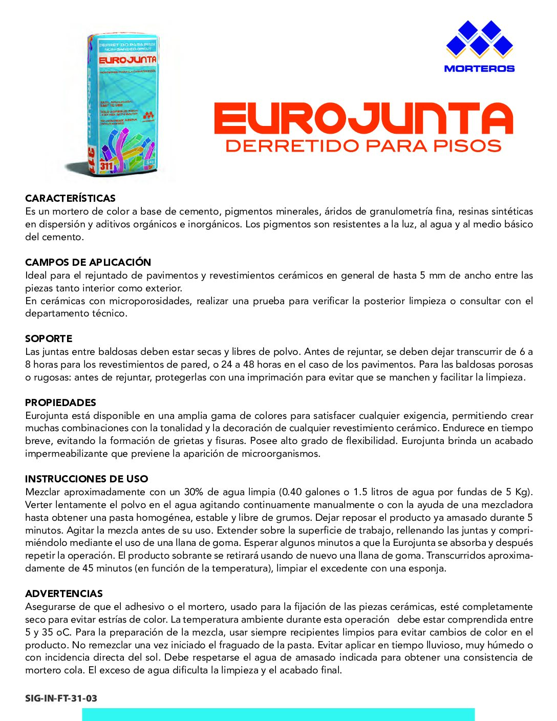 Eurojunta es un derretido para pisos, ideal para el rejuntado de pavimentos y revestimientos cerámicos en general de hasta 5 mm de ancho entre las piezas tanto interior como exterior.