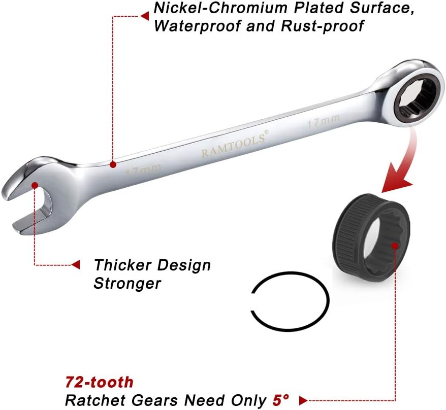 - Buena versatilidad: ambos extremos de la llave incluyen cabeza de trinquete de extremo de caja y cabeza abierta, con métrica y SAE. Son más versátiles y ampliamente utilizados. Adecuado para instalación de equipos, bicicletas, vehículos eléctricos, automóviles y otros equipos de mantenimiento.