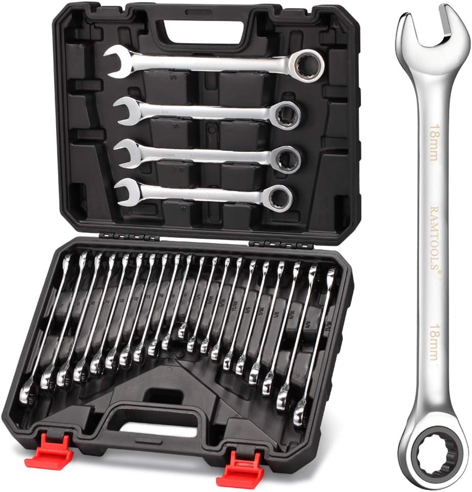 RIMKOLO Juego de 24 llaves de trinquete de acero al cromo vanadio con extremo de caja métrica y SAE de 72 dientes y juego de llaves estándar de extremo abierto con caja organizadora.