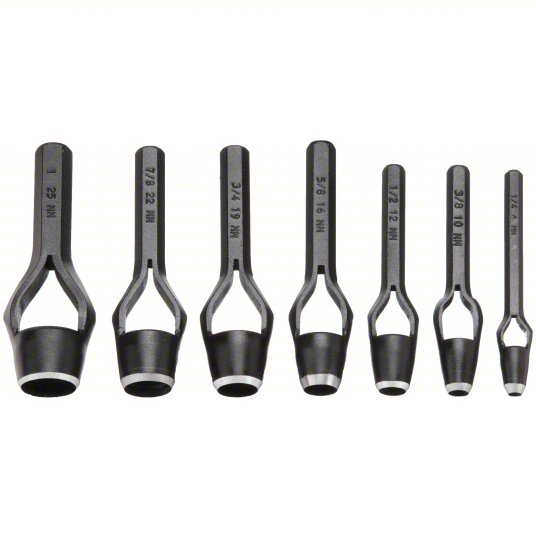 Estos juegos incluyen varios punzones de arco con diferentes tamaños de punta para hacer agujeros de distintos tamaños. La abertura detrás de la cabeza de los punzones de arco permite ver la posición del punzón y acceder a los tapones de material transparente de la cabeza. Su borde de corte afilado y cónico corta limpiamente materiales blandos como caucho, plástico, cuero, cartón y chapa de metal de calibre ligero. Por lo general, se golpean en el mango con un martillo o mazo de cara blanda para hacer la perforación.