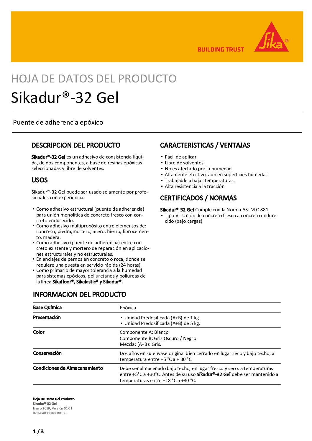 Sikadur®-32 Gel es un adhesivo de consistencia líquida, de dos componentes, a base de resinas epóxicas seleccionadas y libre de solventes.